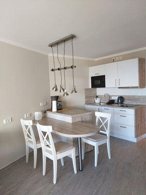 Der modernen Küchenzeile mit Geschirrspüler, Mikrowelle/Grill und Cerankochfelder ist ein Küchenblock gegenüber gestellt an der ein integrierter Tisch / Eßbereich angeschlossen ist.